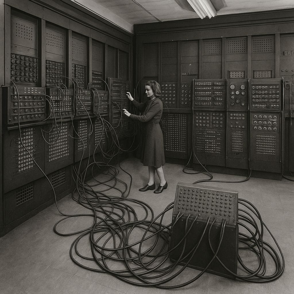 Az ENIAC‑ot 1946 februárjában mutatták be, az első működő elektronikus, programozható, általános célú számítógépként.